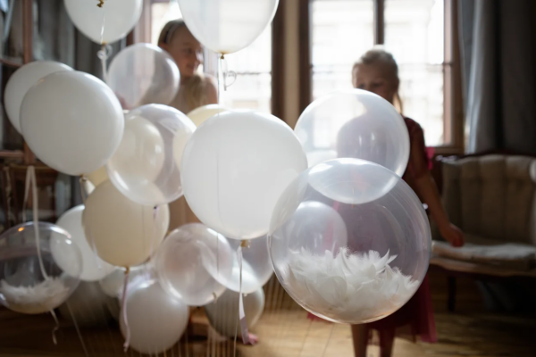 Лёгкая и воздушная композиция, создающая ощущение, будто гости парят в небе. Белые и прозрачные шары с перьями или блестками внутри превращают простую зону в сказочное пространство. Особенно популярна для торжеств, связанных с детьми.