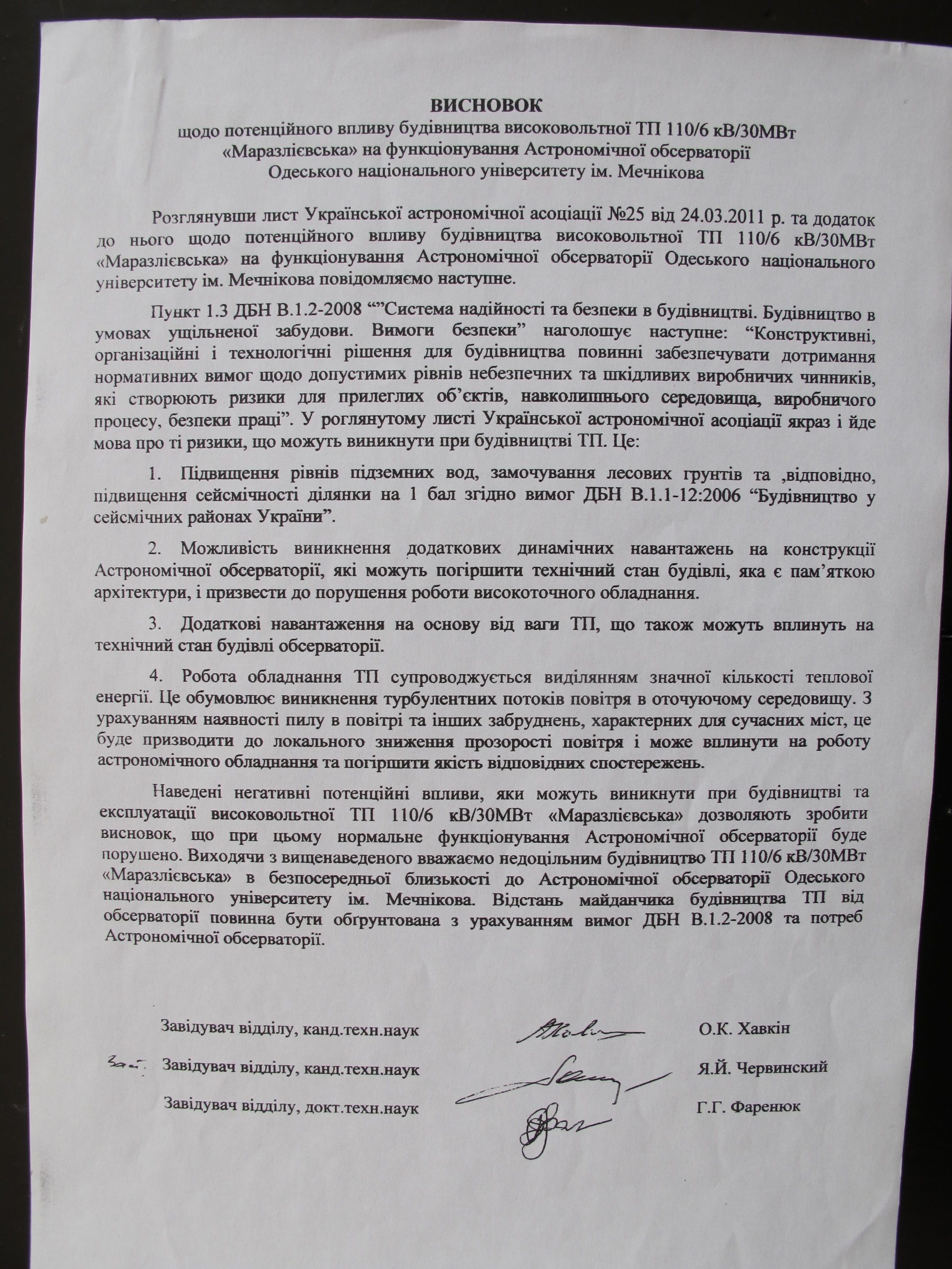 вывод о невозможности строительства, документ, одесса, подстанция