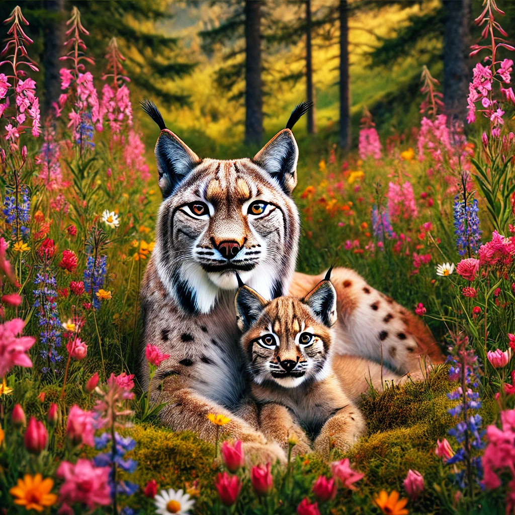 DALL·E - A serene and peaceful scene featuring a lynx and its cub resting in a meadow full of vibrant wildflowers. The lynx has a calm and wise expression, whi.webp